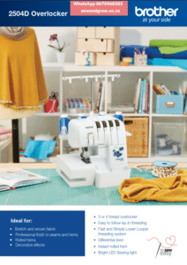 Tailor-made for finishing hems and edges on a wide range of fabrics and creating decorative edges, the Brother 2504D Overlocker is your go-to companion. Elevate your sewing projects to new heights with this versatile and reliable machine, achieving professional finishes with ease. Moreover, experience the joy of creating impeccable garments and home decor projects, thanks to the Brother 2504D Overlocker’s exceptional performance and user-friendly features. So, take your sewing endeavors to the next level with the Brother 2504D Overlocker, and enjoy the seamless transition from amateur to professional craftsmanship.